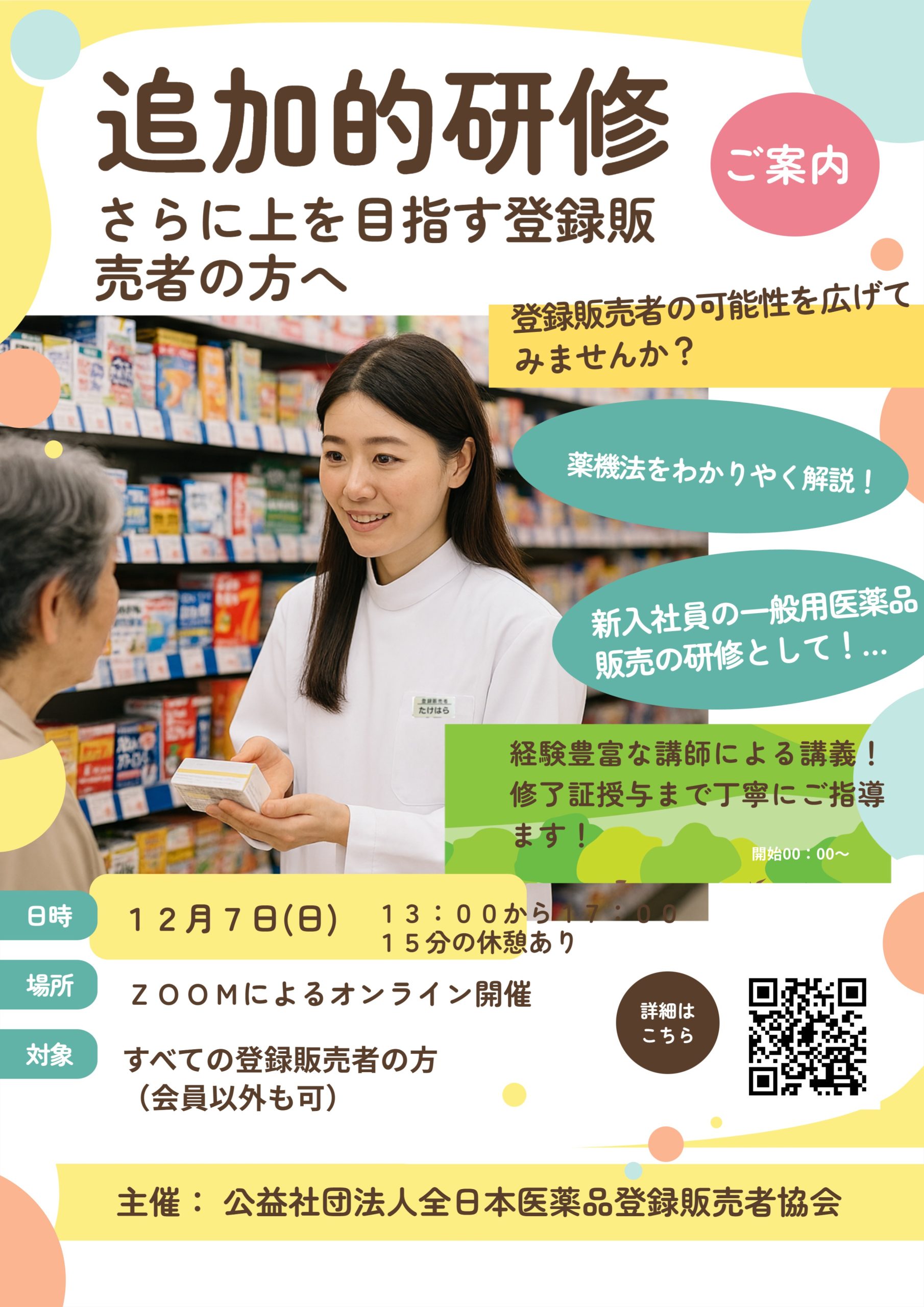 2025/10/06 追加的研修次回開催の案内POPができました 追加的研修の次回12月7日開催の案内POPができました。 皆様のご参加をお待ちしています。 地方協会の皆様は追加的研修の告知等にお使いください。 案内POP お知らせ一覧に戻る